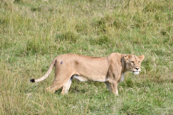 Kulete moves around with her cub on the Mara North plains, hunting successfully and feeding her cub. Kulete is Amani’s daughter littermate to Kweli and Jasiri, born in 2018.