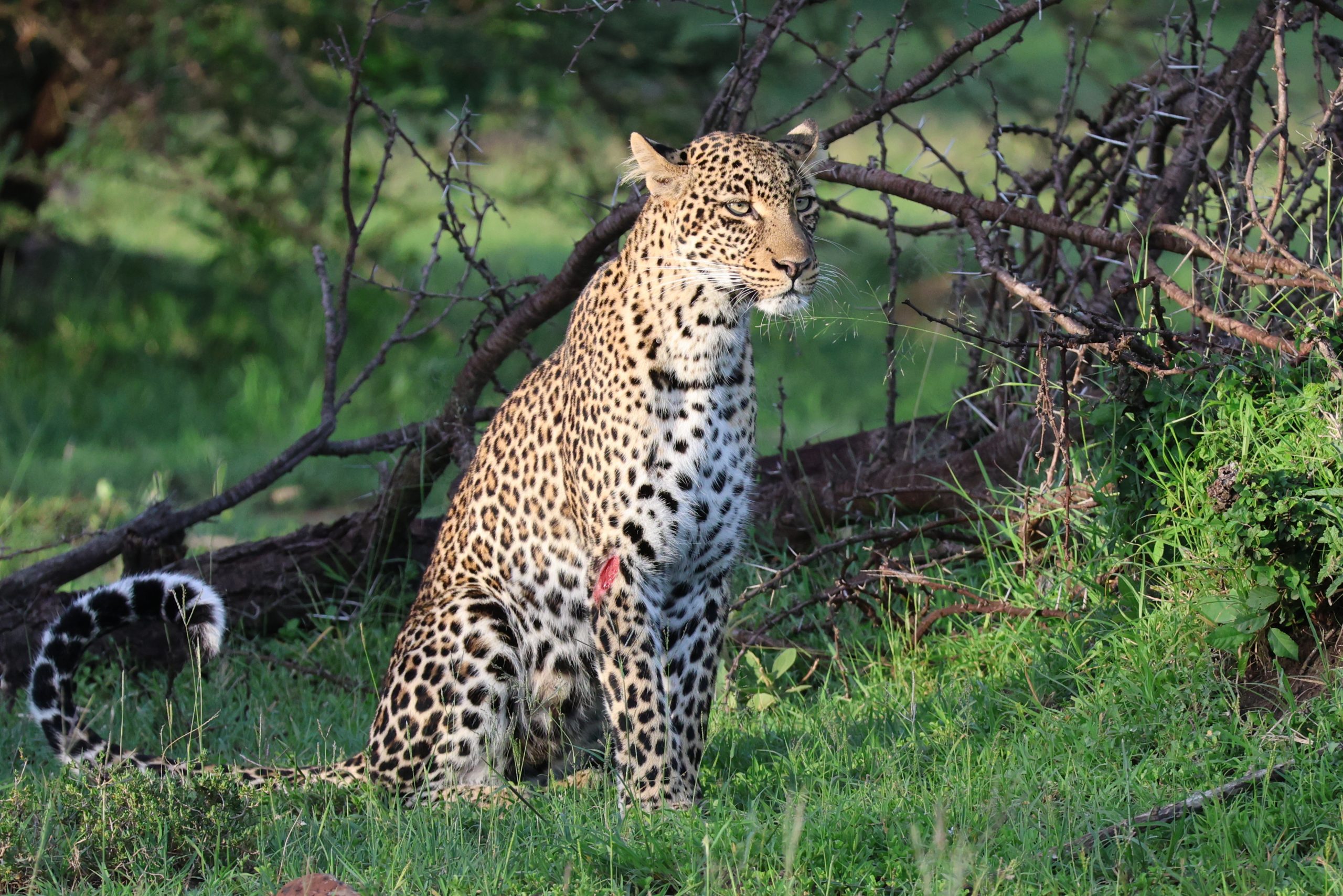 During a recent sighting, we encountered a female leopard known by guides as Akira, whose territory lies in an overlap zone between Olare Motorogi Conservancy and the National Reserve. She is currently raising two cubs. Akira is not often seen, and unlike some of the more frequently sighted leopards in surrounding territories, she tends to stay within dense thickets where visibility is limited. However, in recent days, sightings of her have become more frequent as she has shifted to a more open and accessible area on the Reserve side, likely to raise her cubs there.